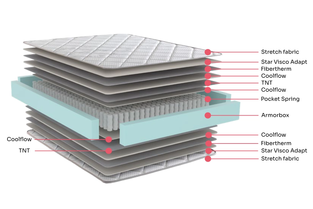 Este colchón reversible está diseñado con acolchados premium como Fiber Therm, Star Visco-Adapt y Coolflow en ambas caras, manteniéndote fresco en verano y cálido en invierno.