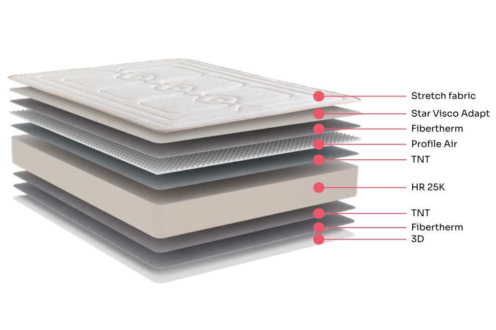 El colchón Casa de Verano está diseñado para ofrecer una experiencia de descanso cómoda y fresca. Su acabado en tejido Stretch en la cara superior proporciona suavidad y confort, mientras que el tejido 3D transpirable en la parte inferior evita la condensación de humedades, ideal para climas cálidos.